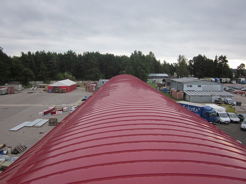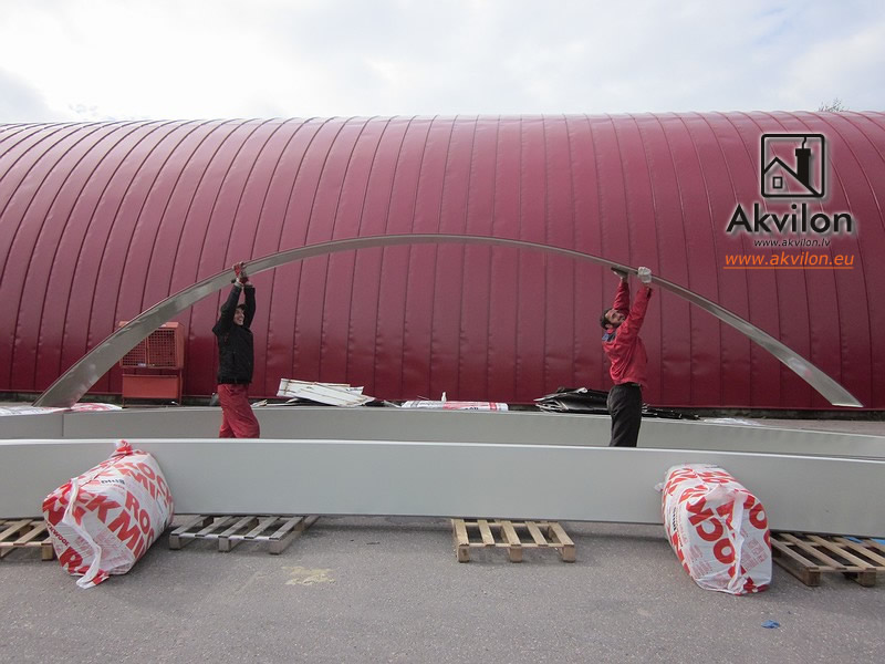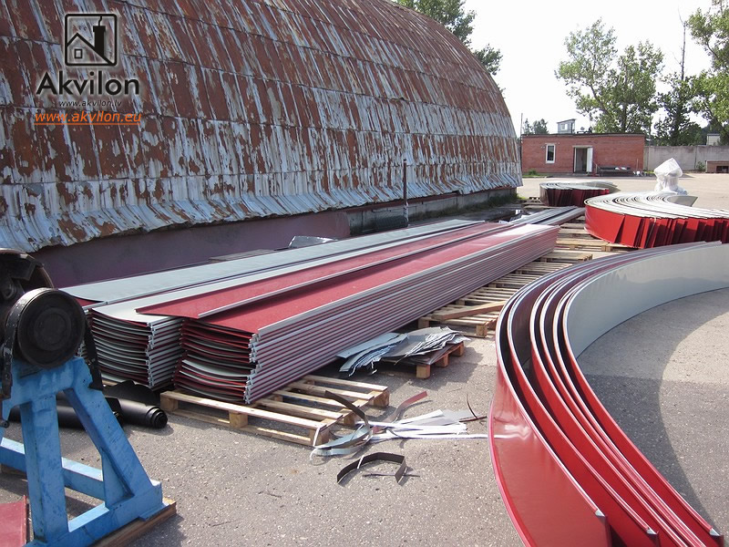 rolled profiles as roofing material for semicircular commercial pavilions, semicircular hangars and any other building where the roof or wall construction requires a curved shape with a radius.SIA Akvilon manufactures high quality semicircular/radius roller profiles from rolled galvanised sheet (with or without polymer coating) and professionally assembles them, and offers on-site fabrication of semicircular roller profiles (rolled galvanised sheet is rolled to the radius of curvature required by the roof on location).