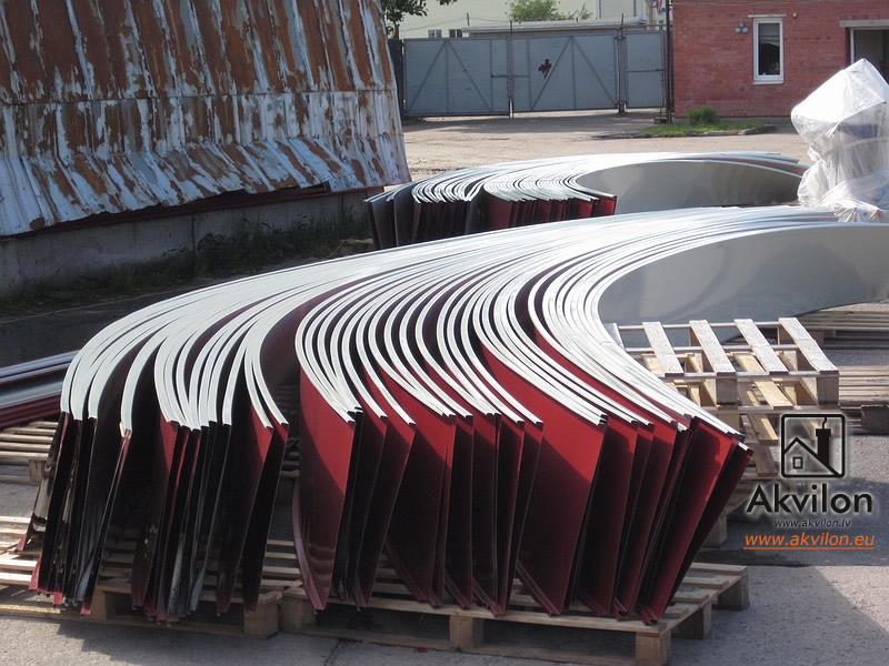 SIA Akvilon manufactures high quality semicircular/radius roller profiles from rolled galvanised sheet (with or without polymer coating) and professionally assembles them, and offers on-site fabrication of semicircular roller profiles (rolled galvanised sheet is rolled to the radius of curvature required by the roof on location).