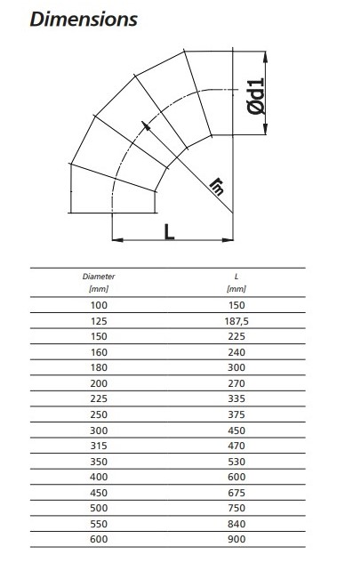 Līkumi ar leņķi 15-90° tiek ražoti diametrā no 100 līdz 1250 mm. Tie ir izgatavota no cinkota tērauda vai melnā tērauda ar biezumu 0,70-2,0 mm ar metinātu garenisko TIG šūvi, kas nodrošina labu hermēisku savienojumu.